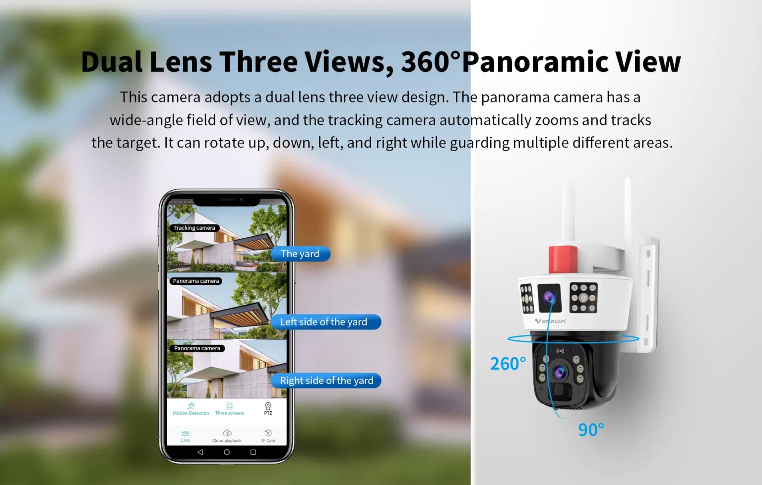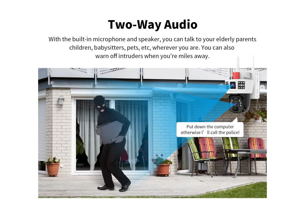 | Video | Night vision | Full color night vision, dual light source, Tracking camera: 6pcs dual source lights Panoramic camera: 12pcs IR lights+6pcs white lights |