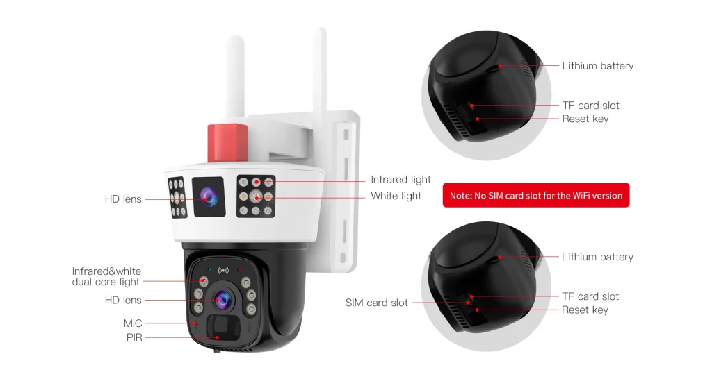 | Alarm | Sound light alarm | Sound light alarm, full color night vision |