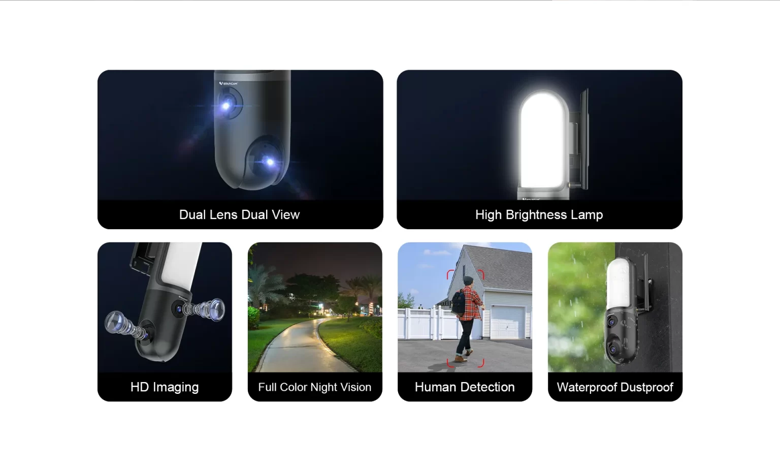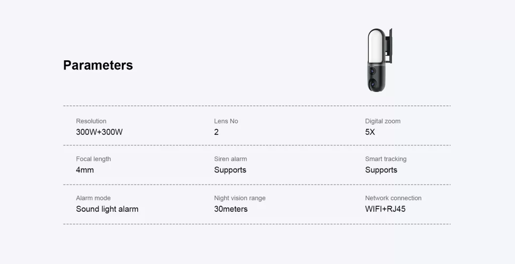 | Alarm | Alarm detection | Motion detection, human detection, human framing, human tracking, and area detection, siren alarm |